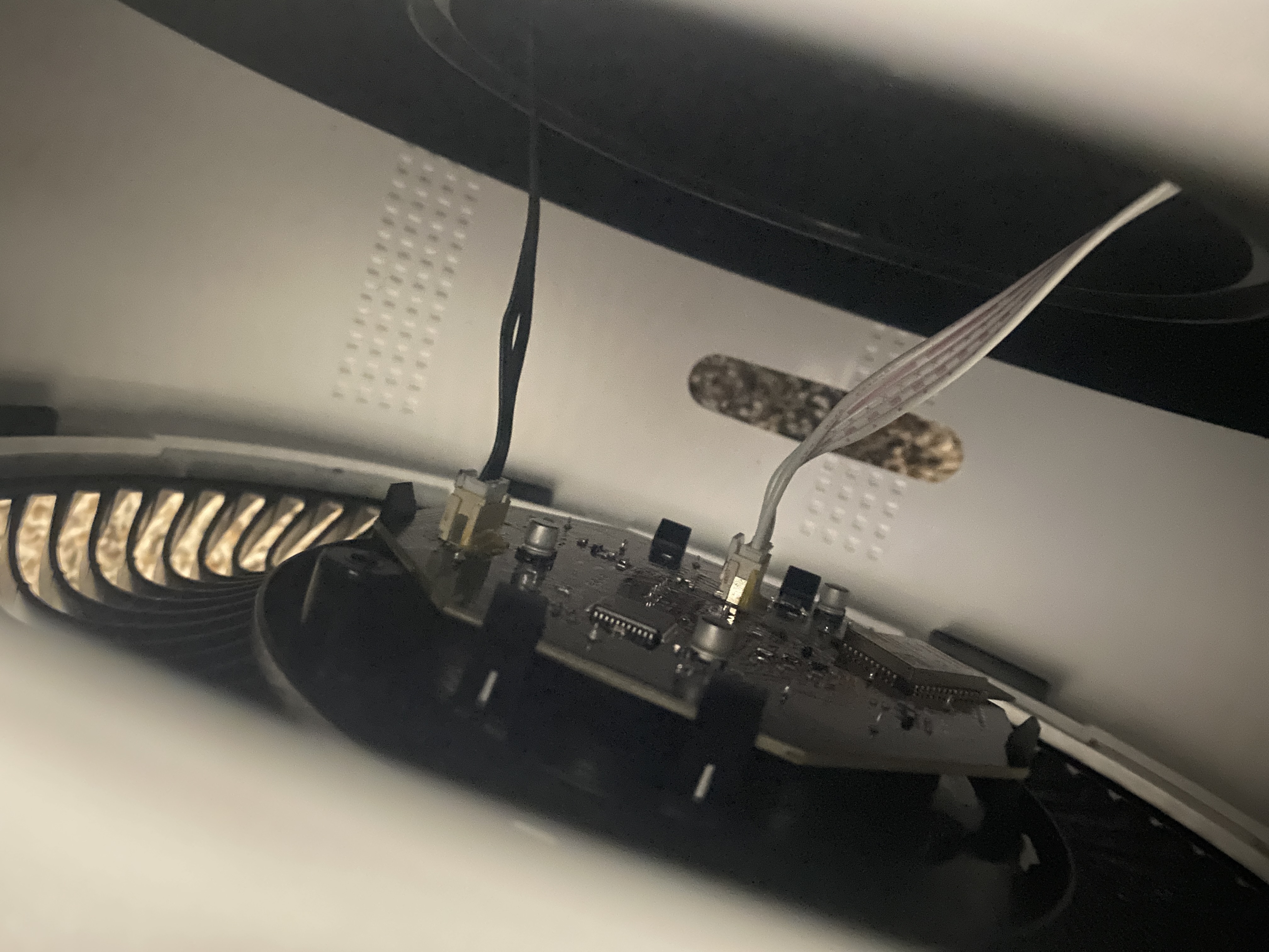 - After pulling the bottom half of the air purifier as far apart from the logic board as possible, you should be able to see the two cable connections holding the purifier together through the two handle holes. This is the fun part, and you can get incredibly creative with. In my case, my buddy was able to use two of the butter knives to disconnect the cable connections. The cable connections have a push button, meaning pressure has to be applied where the cable connects to the display. This part can be incredibly challenging as you have very limited visibility and you have to maneuver the knives in a way to get the cables to disconnect. It’s probably a bit late to say that you should likely be trying to do this disassembly if you are incredibly patient and have the capacity to deal with it at least 30 minutes.